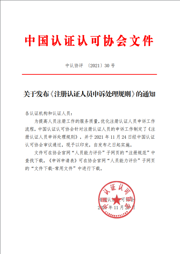 为优化注册认证人员投诉工作流程,提升工作质量,中国 认证认可协会(CCAA)针对注册认证人员的投诉工作制定了《注册认证人员投诉处理规则》《注册认证人员投诉处理规则》,并于 2021 年 11 月 24 日经中国 认证认可协会审议通过,现予发布,自发布之日起实施,《人员注册申诉、投诉与争议处理程序规则》同时废止。 详情如下:
